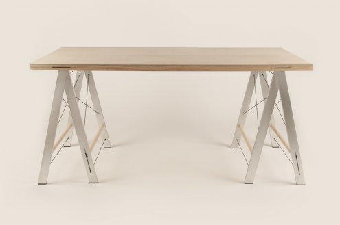Předností stolu je jeho variabilita a možnost rozložení během pár sekund bez nástrojů či pomůcek. Díky systému vedení nylonových lanek uvnitř hliníkového profilu je zajištěna fixace podstavců. Snadným vysazením háčku ve spodní části podstavce dojde k povolení lana a následné možnosti rozložení celé konstrukce. Myšleno bylo na rozložitelnost nejen podstavců stolu, ale také pracovní desky. Za pomocí čepů a systému lan lze tuto pracovní desku rozdělit na dvě poloviny a následně pohodlně přepravit společně s podstavou. Pro nízkou hmotnost této pracovní desky byla přizpůsobena její celková konstrukce. Jedná se o smrkový obvodový rám, na který je nalepena březová překližka pro dojem masivní pracovní plochy. Na spodní straně tohoto rámu jsou vyfrézovány drážky pro zachycení dřevěné vzpěry od podstavce. Díky této drážce je zamezen případný nežádoucí posun podstavců od desky stolu. Tento stůl je primárně určen k prezentaci produktů módní značky Modest Apparel, ale taktéž k běžnému využití jako kancelářský nábytek. Pro závěsný systém, věšák, bylo navrženo ramínko a prvek pro zavěšení skateboardů.